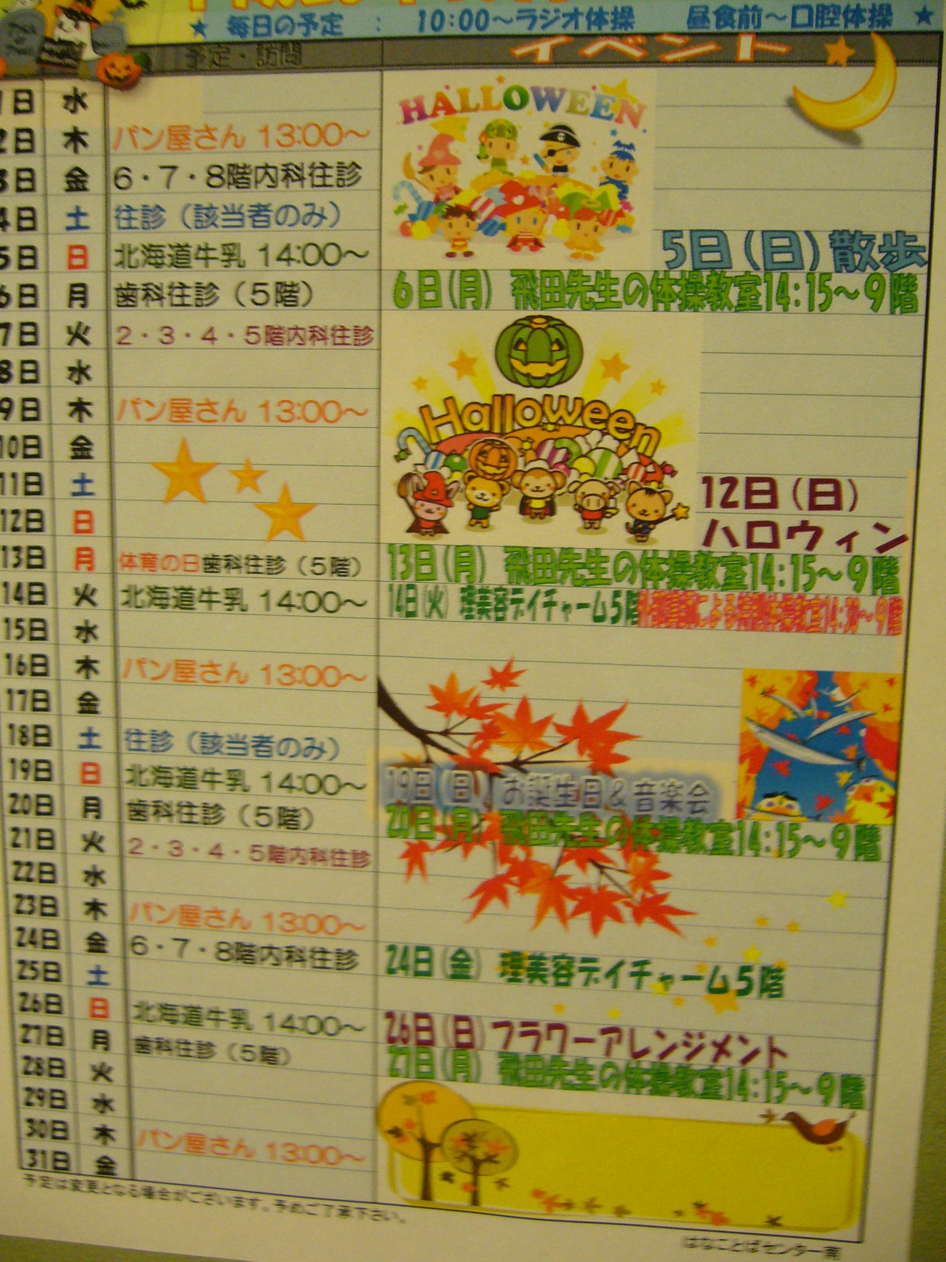 ※こちらは10月の行事・レクリエーション表。レクリエーションは各フロアごとに取り組んでいます★